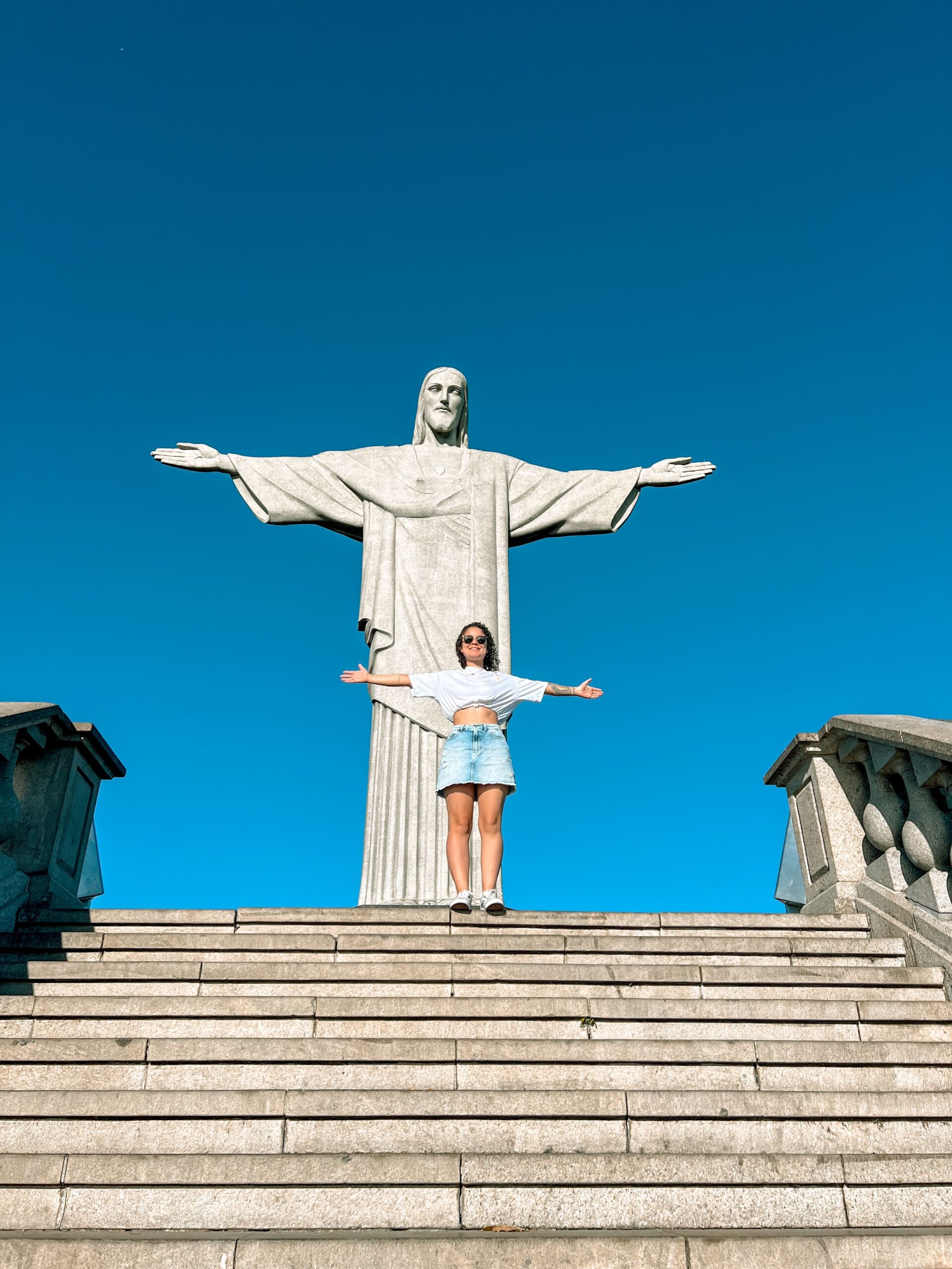 Depois, seguimos direto para o Cristo Redentor, o cartão-postal mais famoso do Brasil. O acesso é feito sem filas, com tudo organizado para você aproveitar a experiência da melhor forma, com calma, com história, e com registros de tirar o fôlego.
