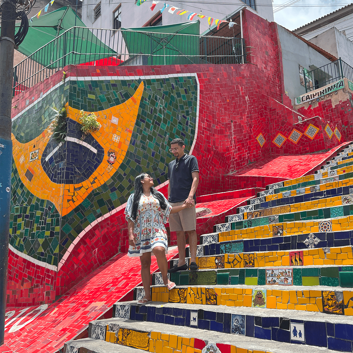 Pra fechar o passeio com charme e cor, visitamos a Escadaria Selarón, na Lapa — um dos lugares mais fotogênicos do Rio. Cada degrau é uma obra de arte, com azulejos do mundo inteiro e um clima único de cultura, arte e alma carioca.
